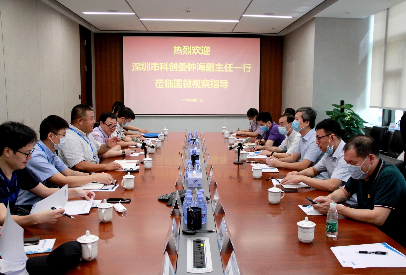2020年6月29日,在“七一”建党节到来之际,深圳市科创委党组成员、副主任钟海带队,携信息处与集成电路中心党支部及基础处党支部一行到国微集团进行调研,共同开展“技术创新引领变革,有效发挥党组织作用”主题党日活动。